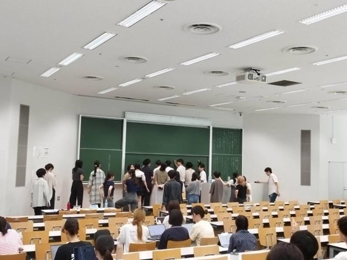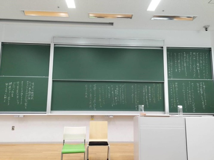このように、黒板の前に集まり、学生一人一人が思い思いの一文を書き連ねており、全員が書き終わった後に、自分が書いた一文を読み上げました。前の文と関連付けた文を書くかどうかは、受講生次第だったので、思いもよらぬ展開があったりと、非常に面白い授業でした!